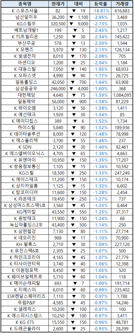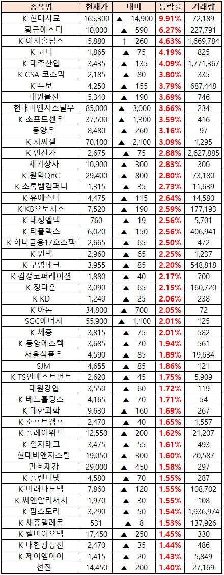 시간외 단일가매매 종가 종목 확인시 단순 급등주 등락률만 볼 것이 아니라, '거래량'에 따르는 거래대금도 판단하면서 보는 것이 중요합니다. (종목명 앞에 'K'는 코스닥 종목을 의미합니다.)