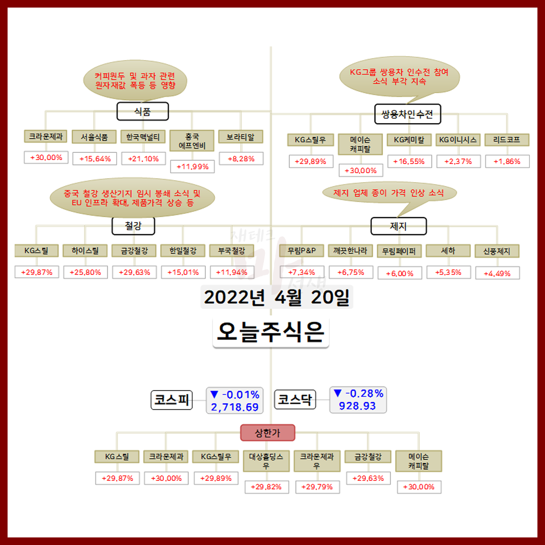 4월 20일 오늘의 상한가 종목 및 이유 :: 크라운제과 대상홀딩스우 금강철강 주가 외