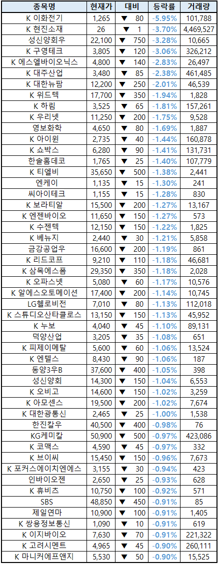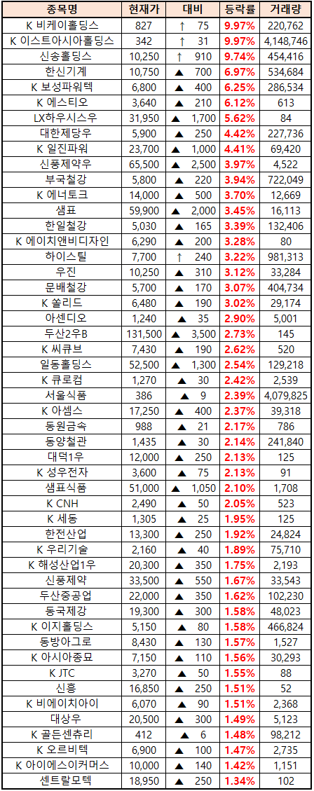 시간외 단일가매매 종가 종목 확인시 단순 급등주 등락률만 볼 것이 아니라, '거래량'에 따르는 거래대금도 판단하면서 보는 것이 중요합니다. (종목명 앞에 'K'는 코스닥 종목을 의미합니다.)