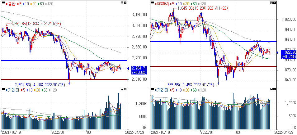 금일 코스피 지수는 -0.86% 하락한 2,704.71에 마감하였고, 코스닥 지수는 -0.74% 하락한 922.78에 마감하였습니다. 미 연준의 빅스텝 우려에 하락을 보였습니다.