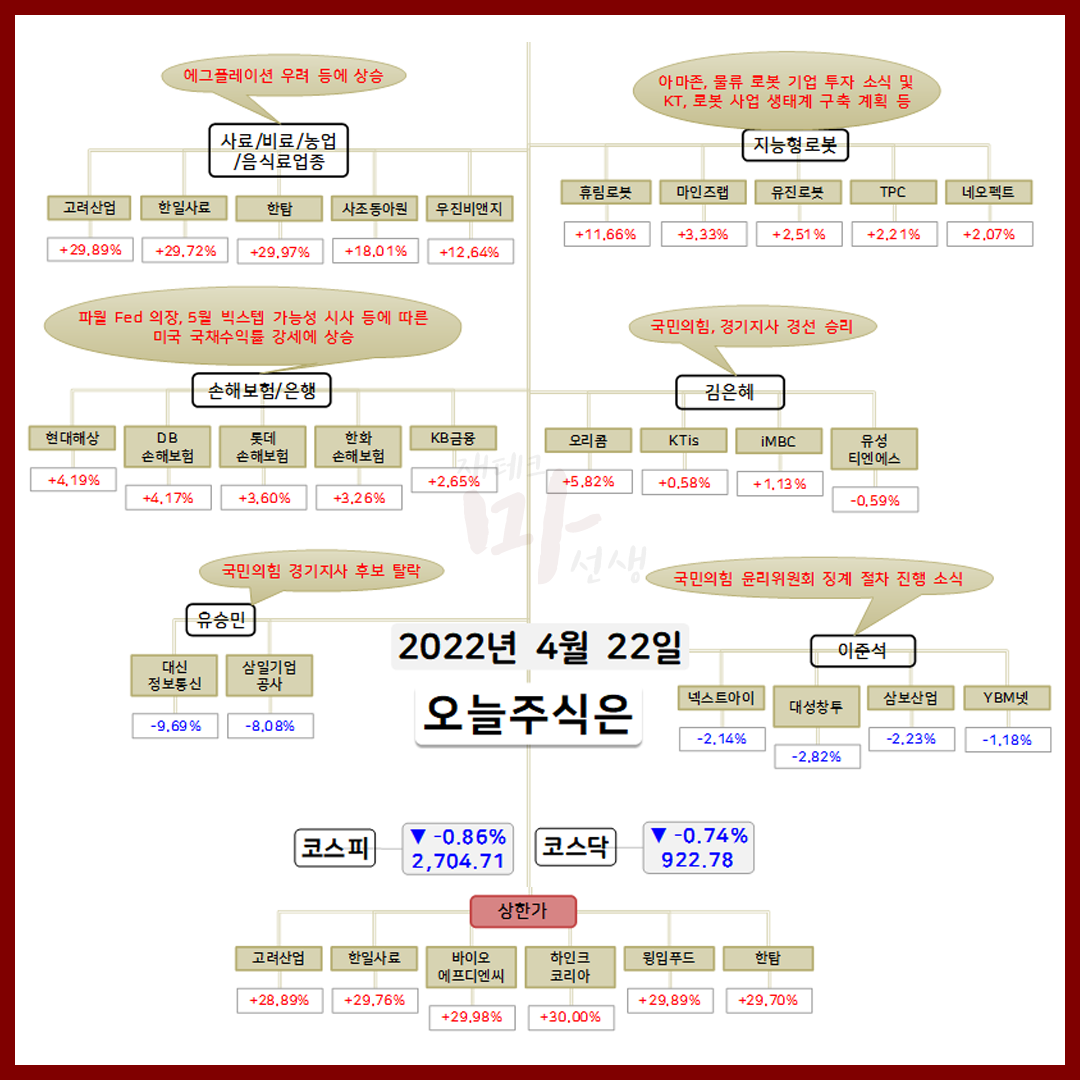 4월 22일 오늘의 상한가 종목 및 이유 :: 고려산업 바이오에프디엔씨 윙입푸드 한탑 주가 외
