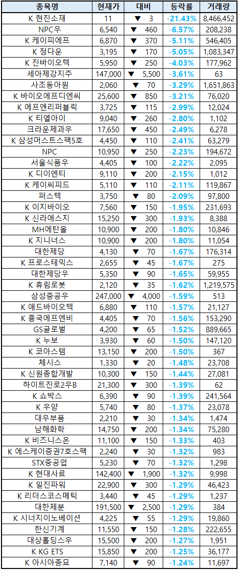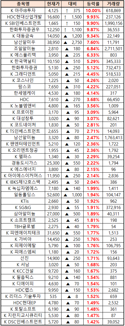 시간외 단일가매매 종가 종목 확인시 단순 급등주 등락률만 볼 것이 아니라, '거래량'에 따르는 거래대금도 판단하면서 보는 것이 중요합니다. (종목명 앞에 'K'는 코스닥 종목을 의미합니다.)