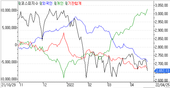 금일 코스피 지수는 -1.76% 하락한 2,657.13에 마감하였고, 코스닥 지수는 -2.49% 하락한 899.84에 마감하였습니다. Fed 공격적 긴축 우려와 중국 베이징 봉쇄 우려 속 하락을 보였습니다.