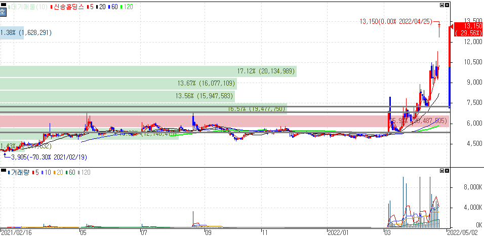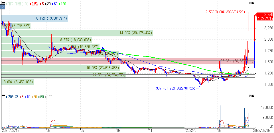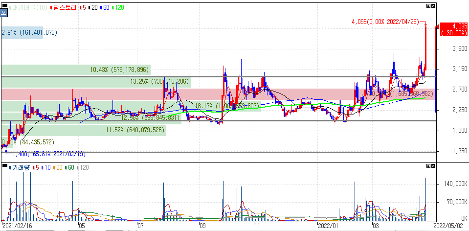 상한가 종목에 대해서만 주로 다루다보니 그동안 이렇게 상승을 보인 이후 하락으로 고점에 물린 케이스를 접하지 못하는 경우가 많은데 대체로 극단적인 상승률을 보여 주의하라고 말씀드린 종목들은 대체로 고점에 물린 투자자들이 많다는 것을 알 수 있습니다.