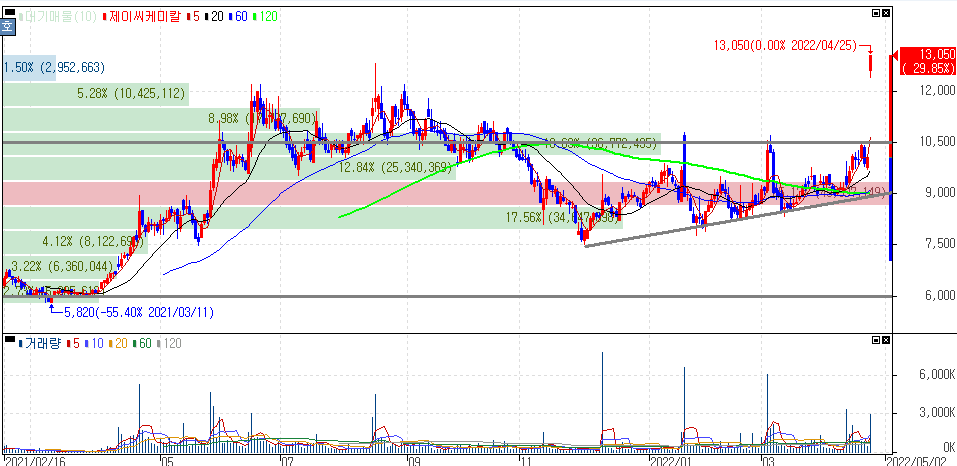 2022년 4월 25일 오늘의 상한가 종목 및 이유 :: 제이씨케미칼 키움제6호스팩 고려산업 샘표 주가 외