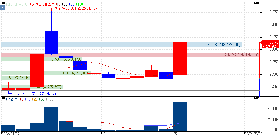 재료 미노출 상한가를 기록한 키움제6호스팩 주가 입니다.