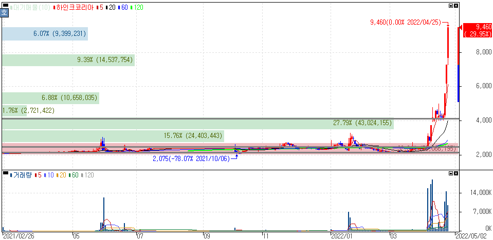 하인크코리아의 주가 상승률도 상당하게 보여지고 있습니다. 늘 그렇듯 이렇게 극단적인 상승률을 보이는 종목들은 늘 주의 하시길 바랍니다.