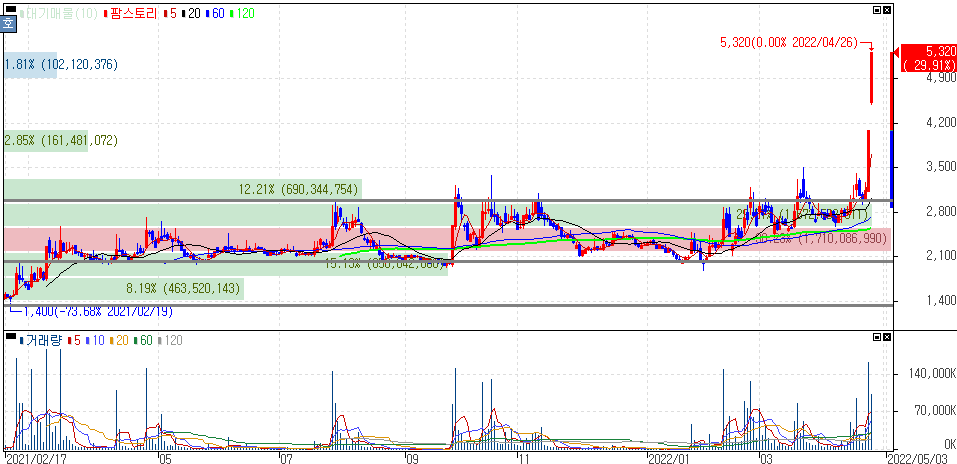 러시아-우크라이나 침공 장기화 등에 따른 수급 차질 우려 지속에 사료, 비료, 농업, 육계, 수산, 음식료업종, 팜유 관련주 상승 속 상한가를 기록한 샘표, 고려산업, 팜스토리, 우리손에프앤지, 한탑 주가 입니다.