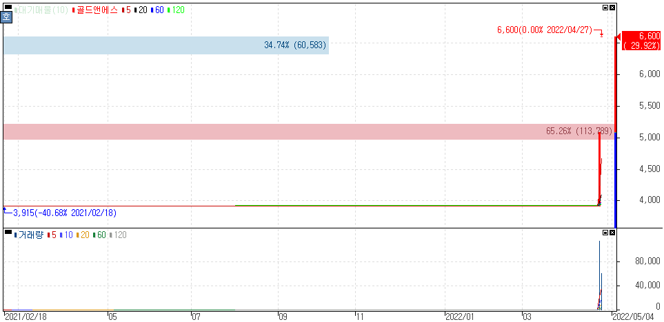상폐 위기에서 벗어나 거래재개 이틀째 상한가를 기록한 골드앤에스 주가 입니다.