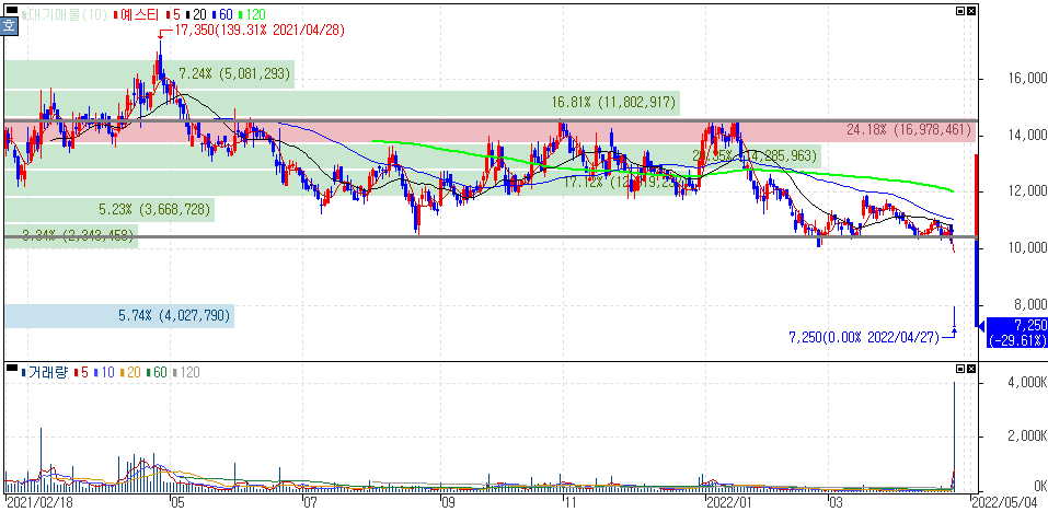 예스파워테크닉스 지분 전량 처분 결정에 하한가를 기록한 예스티 주가 입니다.