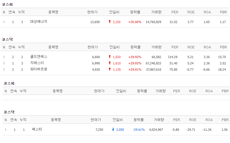 코스피에서는 대성에너지가 상한가를 기록했고, 코스닥에서는 골드앤에스, 지에스이, 파이버프로가 상한가를 기록했습니다. 반면 예스티가 하한가를 기록했습니다.