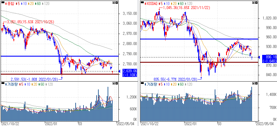 금일 코스피 지수는 -1.10% 하락한 2,639.06에 마감하였고 코스닥 지수는 -1.64% 하락한 896.18에 마감하였습니다.
