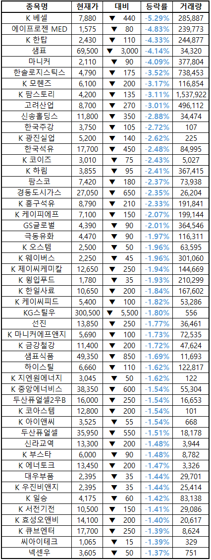 시간외 단일가매매 종가 종목 확인시 단순 급등주 등락률만 볼 것이 아니라, '거래량'에 따르는 거래대금도 판단하면서 보는 것이 중요합니다. (종목명 앞에 'K'는 코스닥 종목을 의미합니다.)
