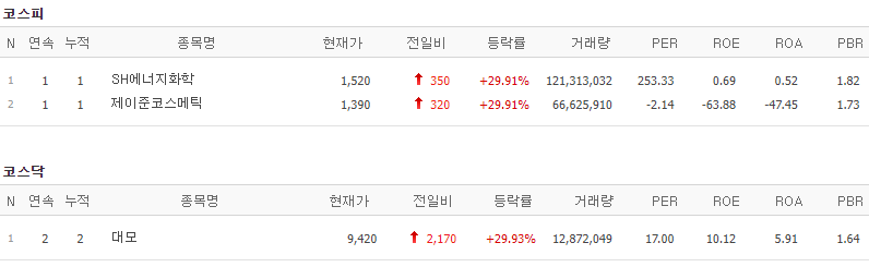 코스피에서는 SH에너지화학, 제이준코스메틱이 상한가를 기록했고, 코스닥에서는 대모가 상한가를 기록했습니다.