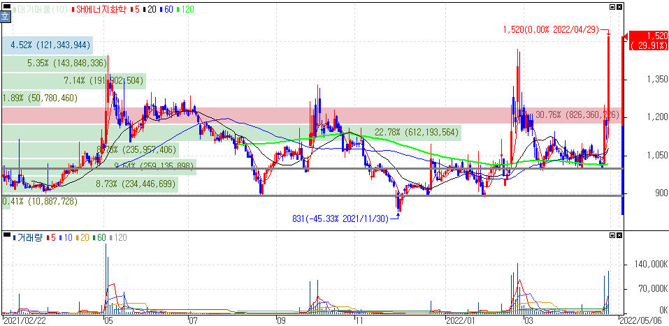 EU, 이르면 내주 러시아 석유 금수조치 가능성 등에 상한가를 기록한 SH에너지화학 주가 입니다.