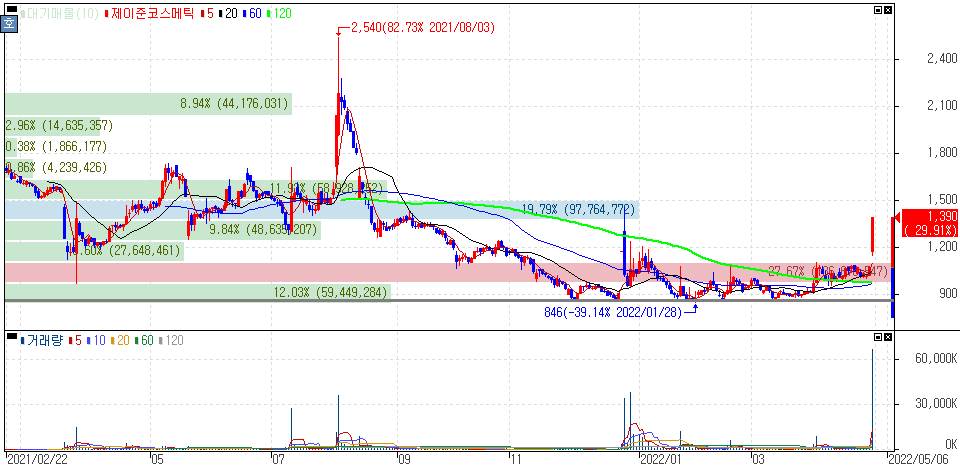 5월2일부터 실외 마스크 착용 해제 소식에 상한가를 기록한 제이준코스메틱 주가 입니다.