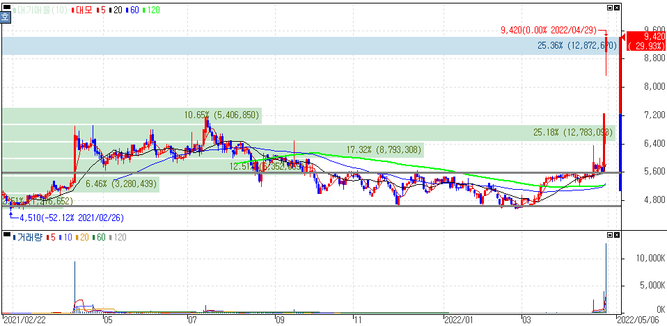 정부, 우크라이나 전후 복구/재건 희망 소식으로 연일 상한가를 기록한 대모 주가 입니다.