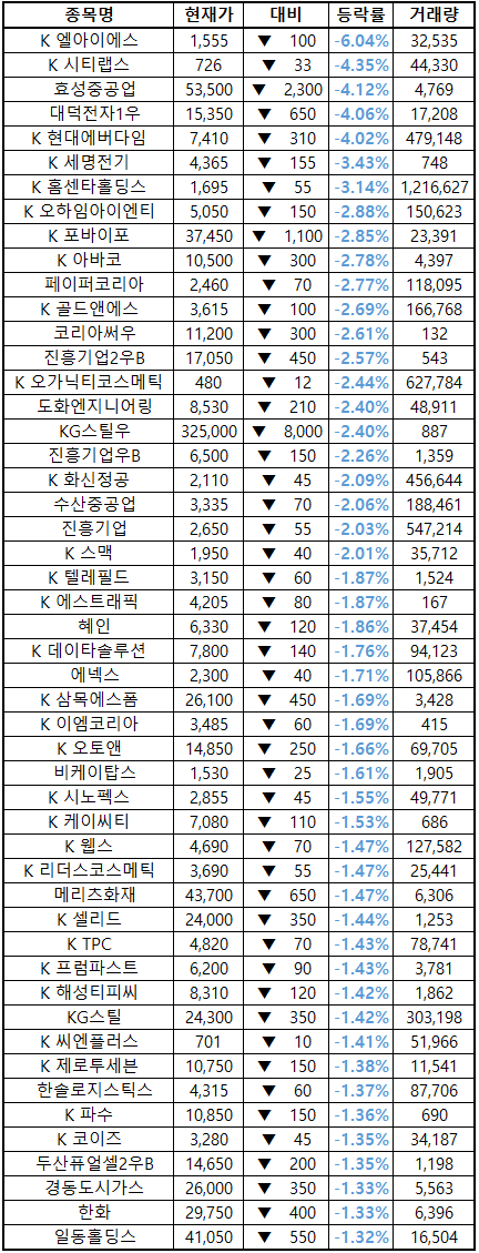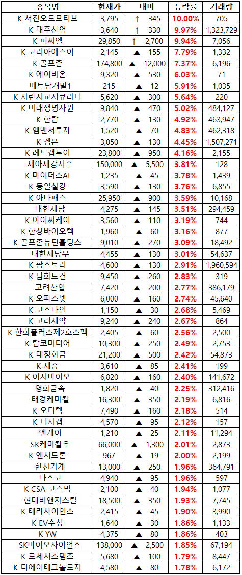 시간외 단일가매매 종가 종목 확인시 단순 급등주 등락률만 볼 것이 아니라, '거래량'에 따르는 거래대금도 판단하면서 보는 것이 중요합니다. (종목명 앞에 'K'는 코스닥 종목을 의미합니다.)