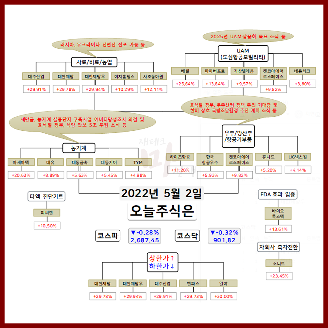 2022년 5월 2일 오늘의 상한가 종목 및 이유 :: 대한제당 대주산업 베셀 멜파스 일야 주가 외 지난 뉴욕증시는 아마존 어닝 쇼크 속 기술주 부진 등에 급락을 보였는데요. 다우 지수는 -2.77% 하락한