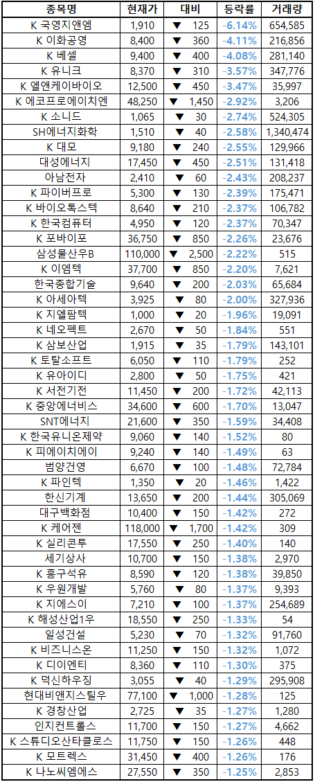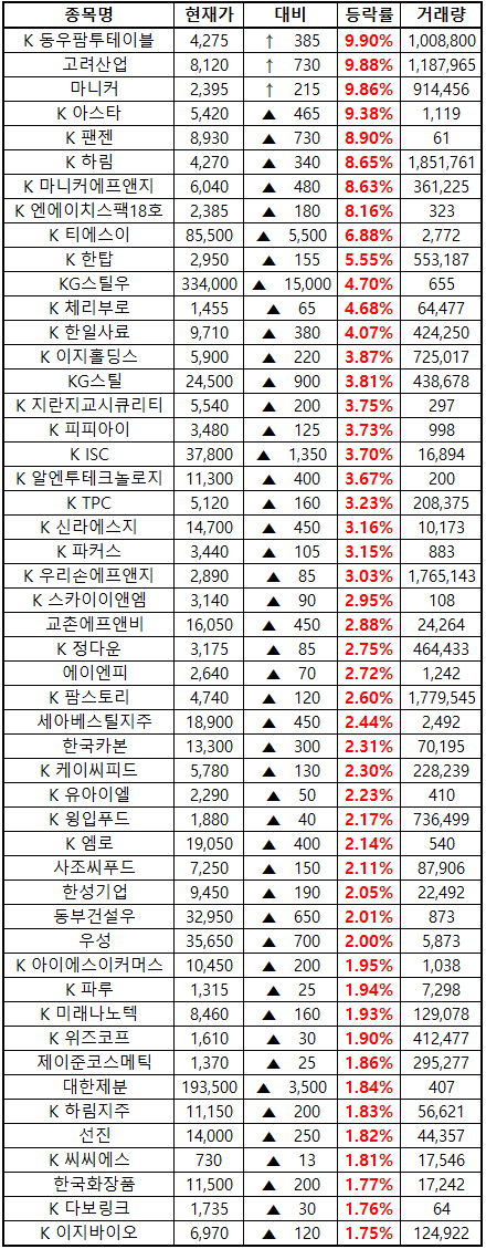 시간외 단일가매매 종가 종목 확인시 단순 급등주 등락률만 볼 것이 아니라, '거래량'에 따르는 거래대금도 판단하면서 보는 것이 중요합니다. (종목명 앞에 'K'는 코스닥 종목을 의미합니다.)