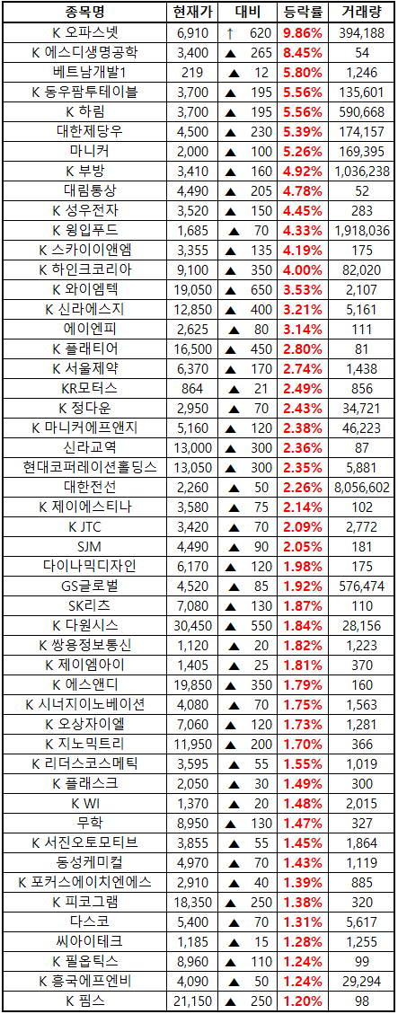 시간외 단일가매매 종가 종목 확인시 단순 급등주 등락률만 볼 것이 아니라, '거래량'에 따르는 거래대금도 판단하면서 보는 것이 중요합니다. (종목명 앞에 'K'는 코스닥 종목을 의미합니다.)
