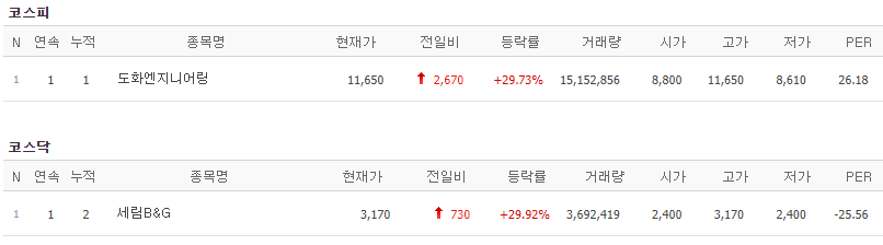 코스피에서는 도화엔지니어링이 상한가를 기록했고, 코스닥에서는 세림B&G가 상한가를 기록했습니다.