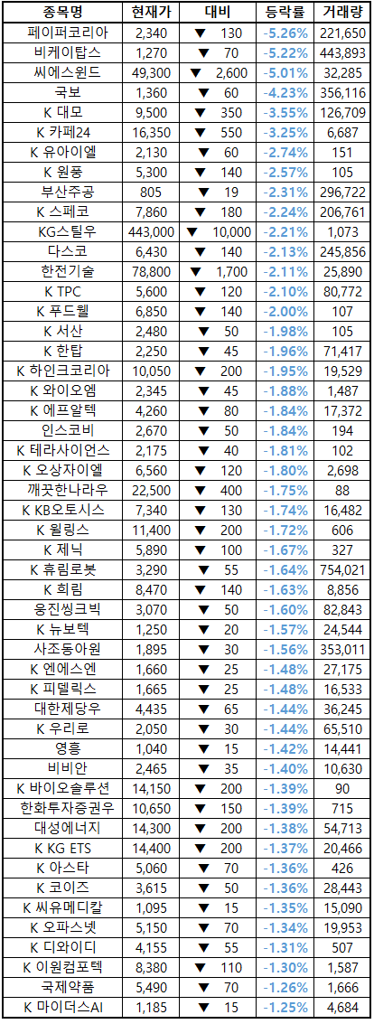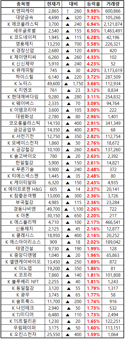 시간외 단일가매매 종가 종목 확인시 단순 급등주 등락률만 볼 것이 아니라, '거래량'에 따르는 거래대금도 판단하면서 보는 것이 중요합니다. (종목명 앞에 'K'는 코스닥 종목을 의미합니다.)