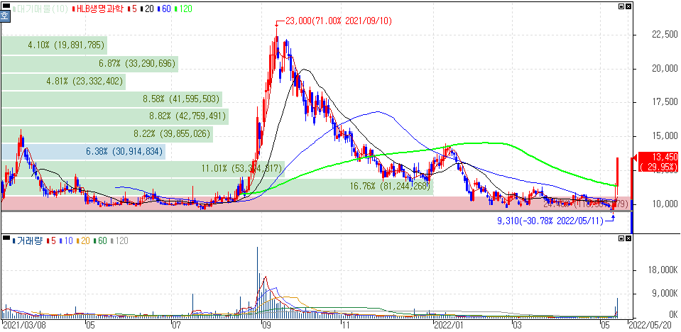 2022년 5월 13일 오늘의 상한가 종목 및 이유 :: HLB생명과학 광명전기 마이더스AI 주가 외