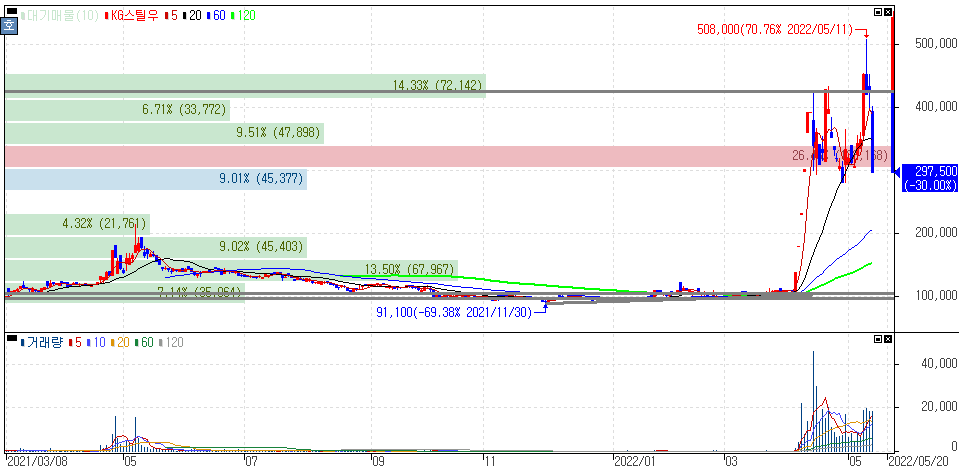 KG그룹, 쌍용차 새 인수예정자로 선정 소식 등으로 주가 변동성을 보이며 하한가를 기록한 KG스틸우 주가 입니다.
