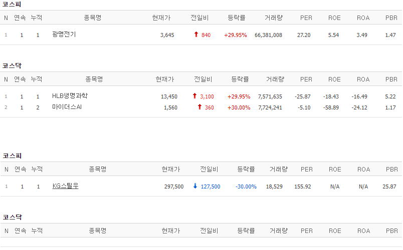 코스피에서는 광명전기가 상한가를 기록했고 코스닥에서는 HLB생명과학 마이더스AI가 상한가를 기록했습니다. 반면 KG스틸우가 하한가를 기록했습니다.