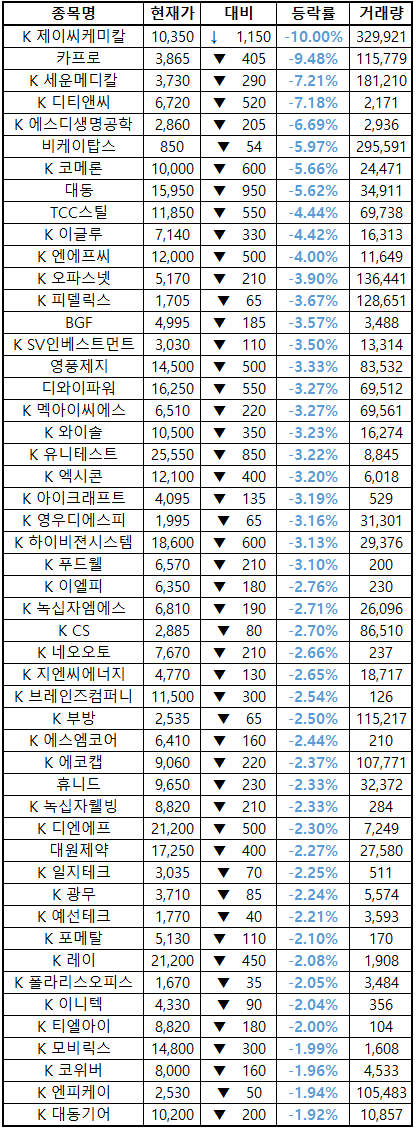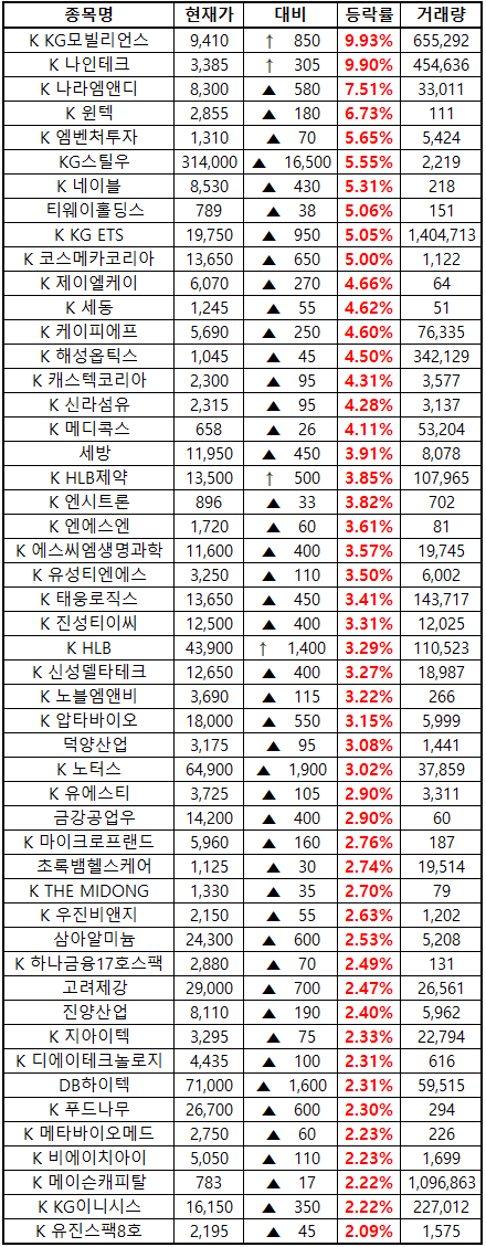 시간외 단일가매매 종가 종목 확인시 단순 급등주 등락률만 볼 것이 아니라, '거래량'에 따르는 거래대금도 판단하면서 보는 것이 중요합니다. (종목명 앞에 'K'는 코스닥 종목을 의미합니다.)