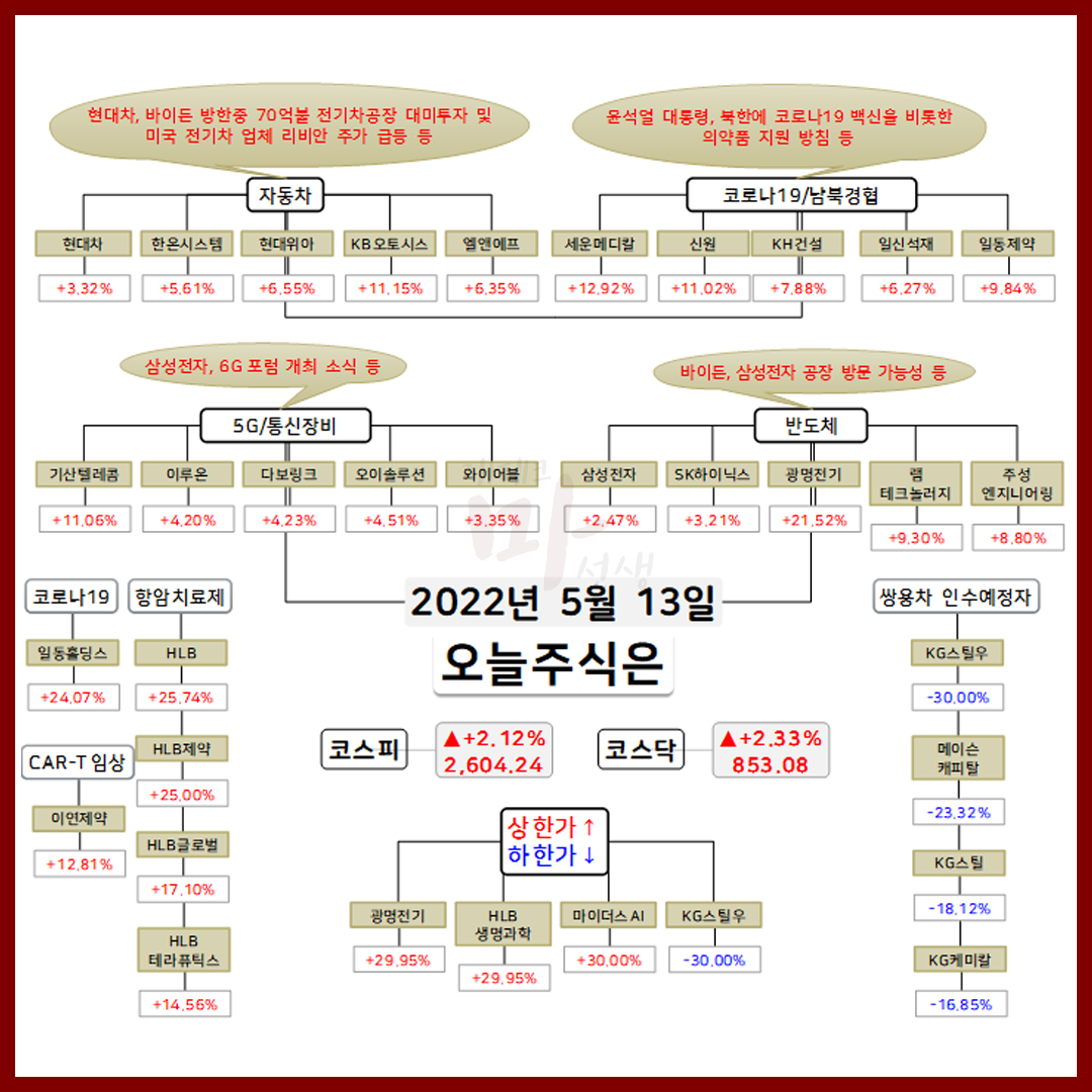 2022년 5월 13일 오늘의 상한가 종목 및 이유 :: HLB생명과학 광명전기 마이더스AI 주가 외 지난 뉴욕증시는 인플레이션 우려·가상화폐 급락 등에 위험회피 심리 지속 속 혼조로 마감하였는데요. 다