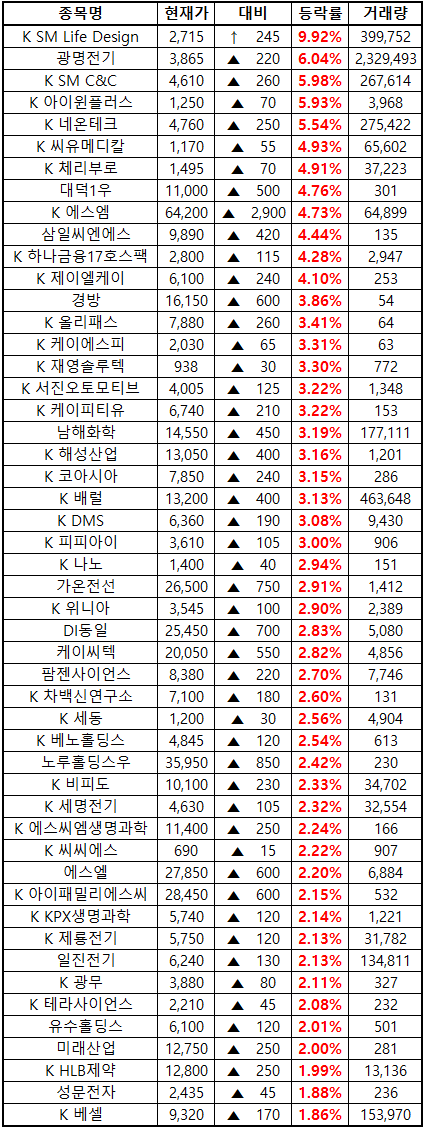 시간외 단일가매매 종가 종목 확인시 단순 급등주 등락률만 볼 것이 아니라, '거래량'에 따르는 거래대금도 판단하면서 보는 것이 중요합니다. (종목명 앞에 'K'는 코스닥 종목을 의미합니다.)