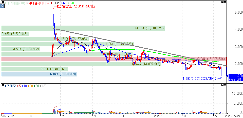 게다가 실적발표 시즌인데 어제 나온 분기보고서를 보면 적자지속세가 이어지고 있다는 것을 알 수 있습니다. 작년에 상장된 이후 주가 흐름은 지속적인 하락세를 보이고 있는데 단기간 구간이 형성되더라도 반등을 보이지 않고 있기 때문에 변곡점이 어디인지를 확실히 파악하는게 중요합니다.