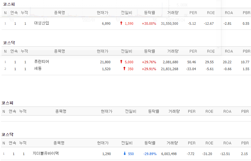 2022년 5월 17일 오늘의 상한가 종목 및 이유 :: 퓨런티어 세동 대성산업 주가 외