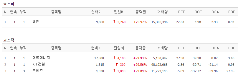 코스피에서는 혜인이 상한가를 기록했고, 코스닥에서는 대명에너지, KH 건설, 코이즈가 상한가를 기록했습니다.