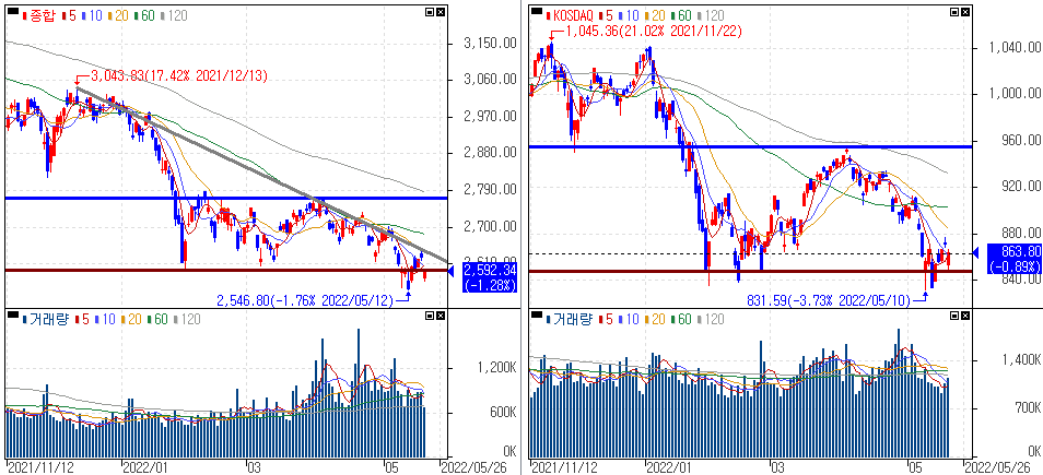 금일 코스피 지수는 -1.28% 하락한 2,592.34에 마감하였고, 코스닥 지수는 -0.89% 하락한 863.80에 마감하였습니다. 美 폭락장 여파에 하락을 보였습니다.