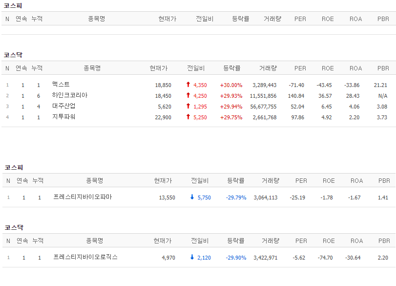 코스피에서는 상한가 종목이 없었고, 코스닥에서는 맥스트, 하인크코리아, 대주산업, 지투파워가 상한가를 기록했습니다. 반면 프레스티지바이오파마, 프레스티지바이로직스가 하한가를 기록했습니다.