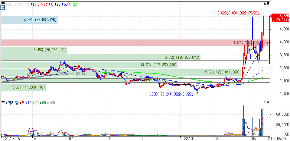 우크라이나 전쟁 이후 식량 수출 금지 국가 14개국으로 증가 소식 등에 상한가를 기록한 대주산업 주가 입니다.