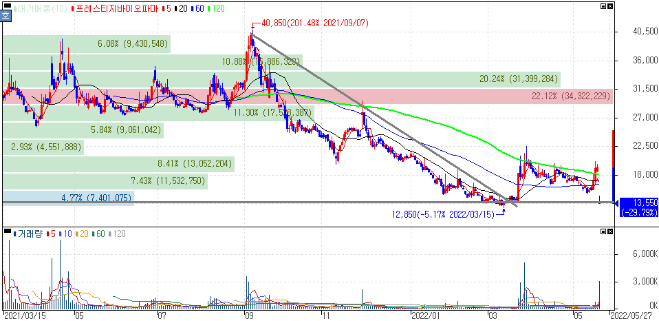 지난 프레스티지바이오파마와 프레스티지바이오로직스를 보면 일정 가격대 내의 하락추세 끝 급등을 보이며 구간이 형성되어가던 모습이였는데 갑작스러운 유럽發 소식이 나오며 급락을 보였습니다.