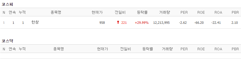 코스피에서는 한창이 상한가를 기록했고, 코스닥에서는 상한가 종목이 없었습니다.