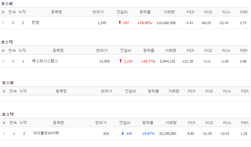 코스피에서는 한창이 상한가를 기록했고, 코스닥에서는 에스피시스템스가 상한가를 기록했습니다. 반면 지더블유바이텍이 하한가를 기록했습니다.
