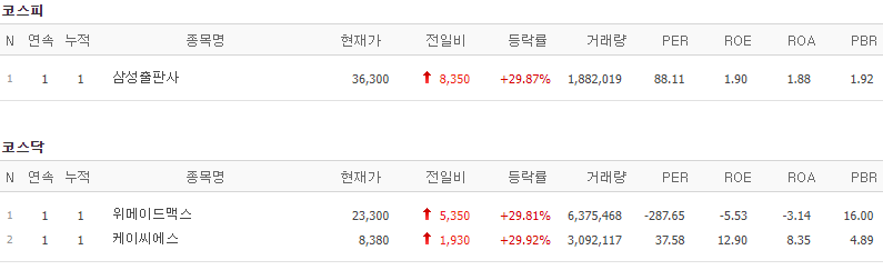 코스피에서는 삼성출판사가 상한가를 기록했고, 코스닥에서는 위메이드맥스, 케이씨에스가 상한가를 기록했습니다.
