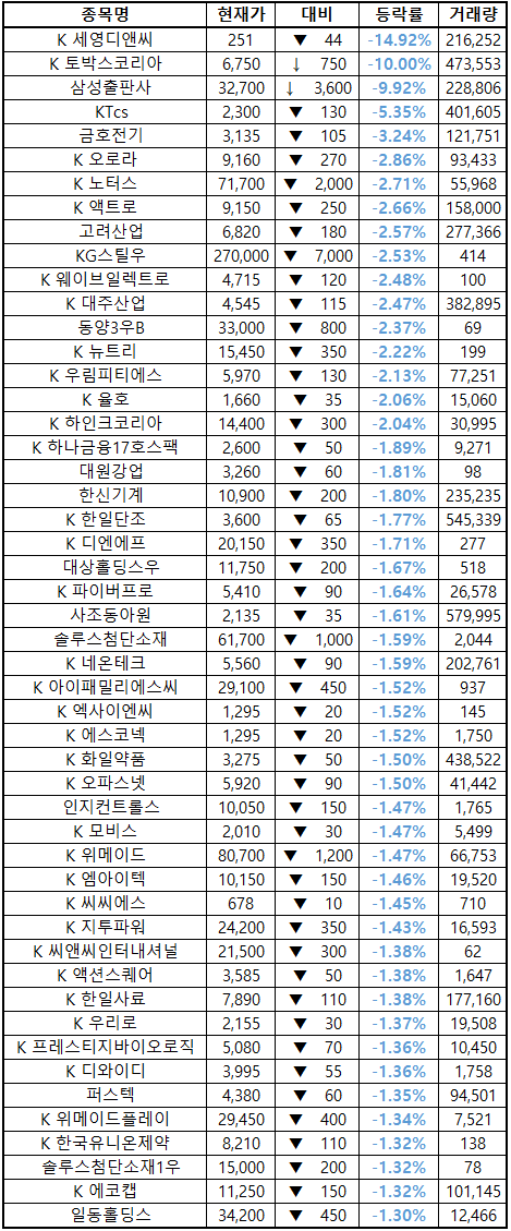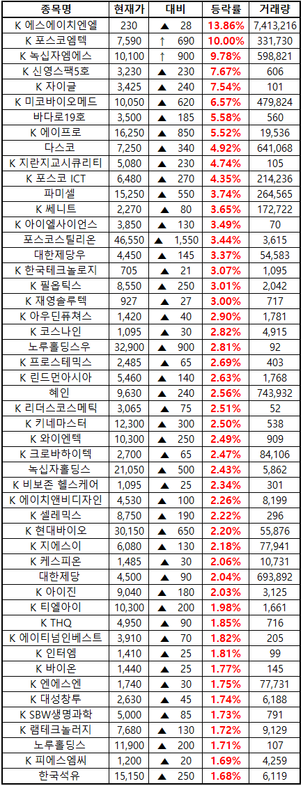 시간외 단일가매매 종가 종목 확인시 단순 급등주 등락률만 볼 것이 아니라, '거래량'에 따르는 거래대금도 판단하면서 보는 것이 중요합니다. (종목명 앞에 'K'는 코스닥 종목을 의미합니다.)