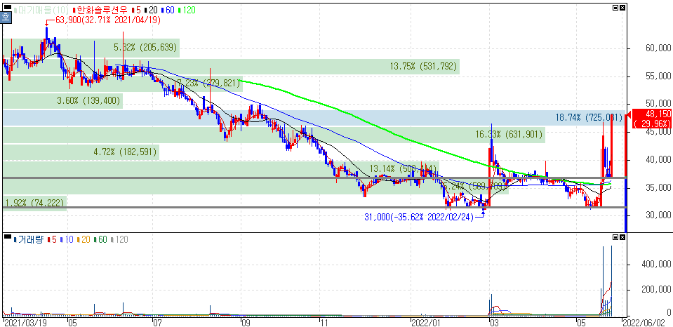 신재생에너지 발전 설비 용량, 원자력 설비 비중 추월 소식 등에 상한가를 기록한 한화솔루션우, SDN 주가 입니다.