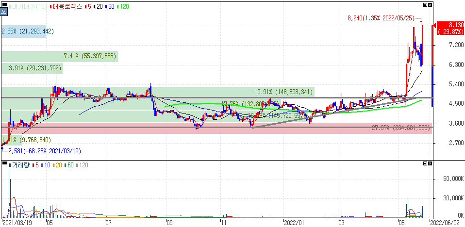 태웅로직스는 해상운임지수까지 최근 다시 반등을 보인다는 이야기가 나오면서 종합물류 및 해운주 등의 주가 변동성을 보여주었는데요. 5월 들어서 신고가를 보이며 주가 흐름을 보이는 만큼 투자성향에 따라서 매매 방식이 다를 수 있으나 지지저항 구간과 물량에 주시 할 수 밖에 없습니다.