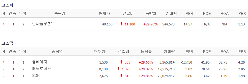 코스피에서는 한화솔루션우가 상한가를 기록했고, 코스닥에서는 썸에이지, 태웅로직스, SDN이 상한가를 기록했습니다.