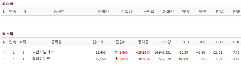 코스피에서는 상한가 종목이 없었고, 코스닥에서는 녹십자엠에스, 플레이위드가 상한가를 기록했습니다.