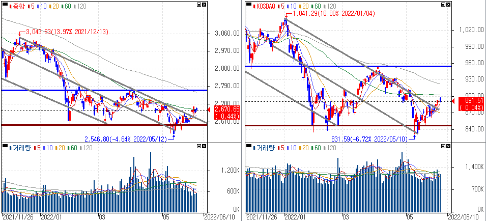 금일 코스피 지수는 +0.44% 상승한 2,670.65에 마감하였고, 코스닥 지수는 +0.04% 상승한 891.51에 마감하였습니다. 뉴욕증시 훈풍에 상승을 보였으나 소비자 물가 상승률 여파에 상승폭을 줄였습니다.