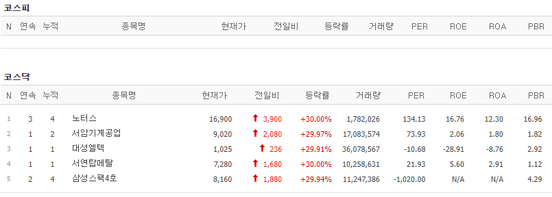 코스피에서는 상한가 종목이 없었고, 코스닥에서는 노터스, 서암기계공업, 대성엘텍, 서연탑메탈, 삼성스팩4호가 상한가를 기록했습니다.